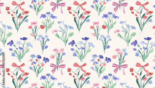 Vector Floral Seamless Pattern with Bows and Ribbons, Preppy Spring Summer Hand Drawn Flowers, Cute Modern Print for Fabric, Wallpaper, Wrapping Paper