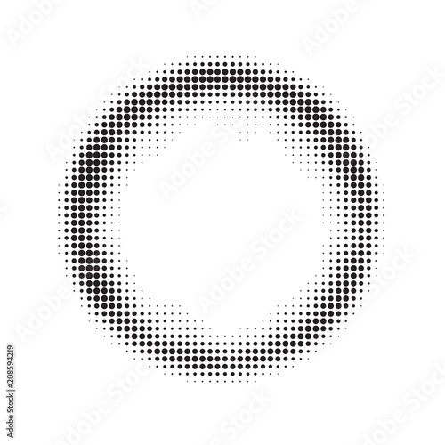 Vector grunge frame pattern, halftone, black and white graphics, circle of small black dots arranged randomly. Round banner, aureole, halation border