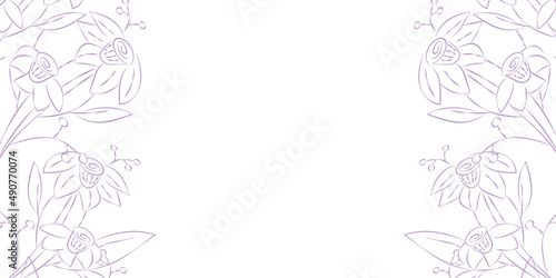 Vector illustration. Festive floral background in lilac tones, copy space for your text. Frame of narcissus flowers in purple. Rustic style horizontal template, hand drawn.