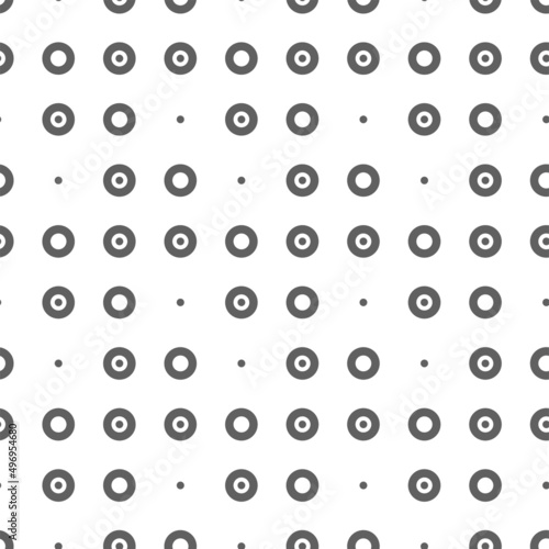Vector illustration. Geometric seamless pattern. Solid dots and rhombus-shaped linear circles. Spotted gray and white background. Simple black and white abstract pattern.