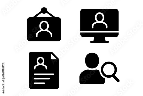 Vector illustration icons representing identification, online profiles, and user data management activities at a digital workspace