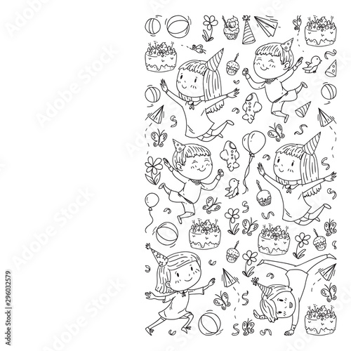 Vector illustration in cartoon style, active company of playful preschool kids jumping, at a party, birthday. Monochrome style in black and white color.