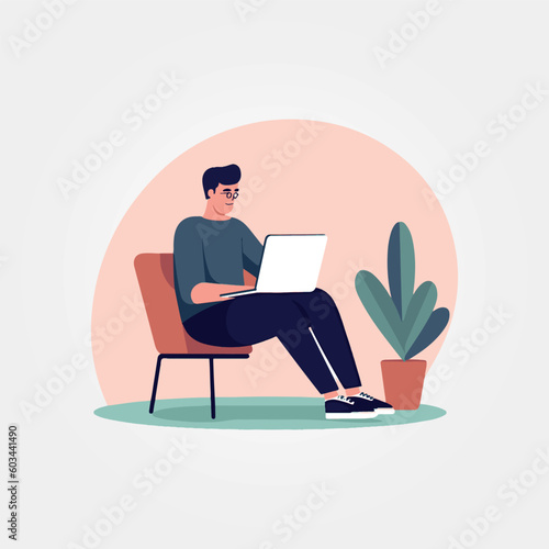 vector illustration, man sitting working with notebook on his lap