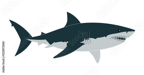 Vector Illustration of a Great White Shark with a Dark Blue Back and Grey Underside on a White Background Showing Teeth and Fins