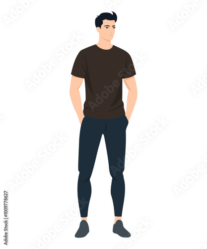 Vector illustration of a woman in a black t-shirt and black pants. Black minimalism