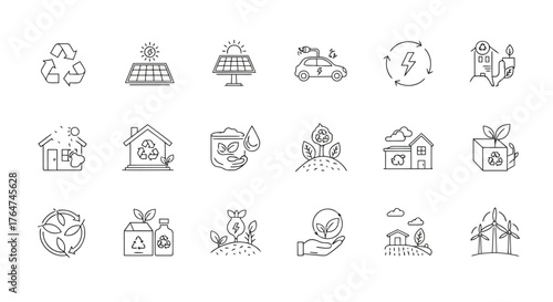 Vector illustration of collection of environmental and renewable energy icons with a clean, modern design