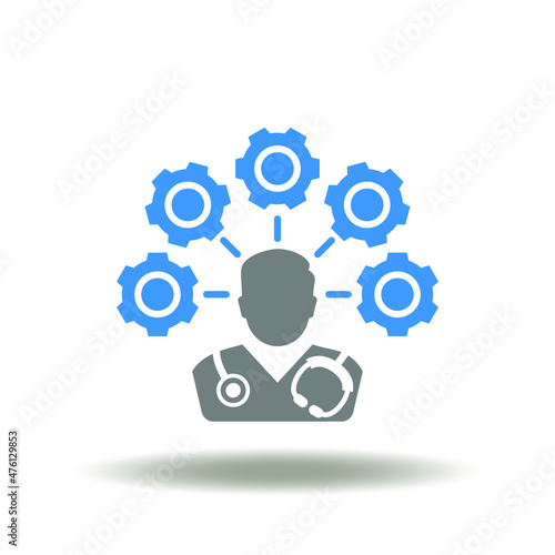 Vector illustration of doctor with gears. Icon of medical or pharmacy responsibility. Symbol of medicine staff roles and resposibilities.