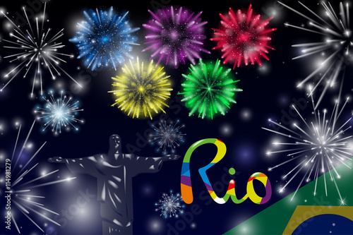 Vector Illustration of Fireworks. Realistic colored firecrackers on a black background. Lettering Rio. Sport concept banner. 2016 Brazil.