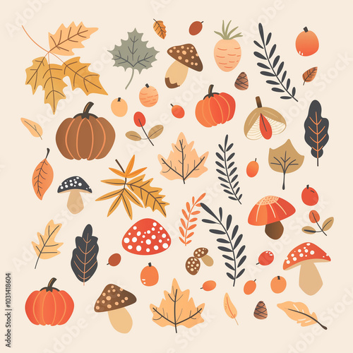 Vector illustration of happy thanksgiving background and elements like acorns, apples, pumpkins