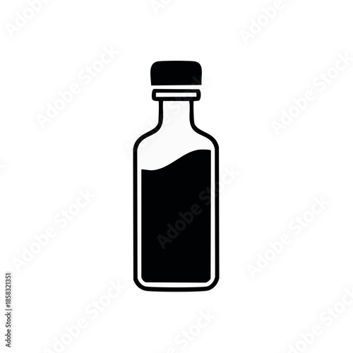 Vector Illustration of Liquid in Bottle Container. Dark Fluid Inside Closed Transparent Glass Bottle with Lid. Black and White Isolated Design.