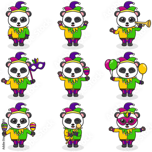 Vector illustration Panda wearing mardi gras clothes in different poses isolated on white background. A cartoon illustration of a Mardi Gras Panda . Mardi Gras jester, set.