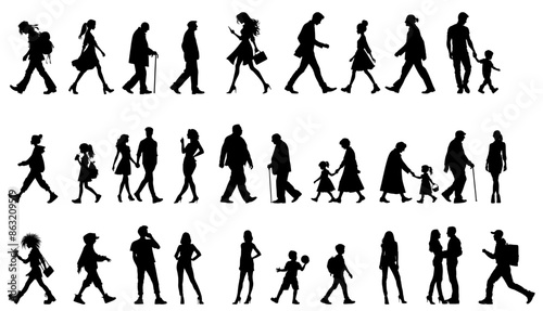 vector illustration. silhouettes of people walking along the street. Large set of characters of different ages.