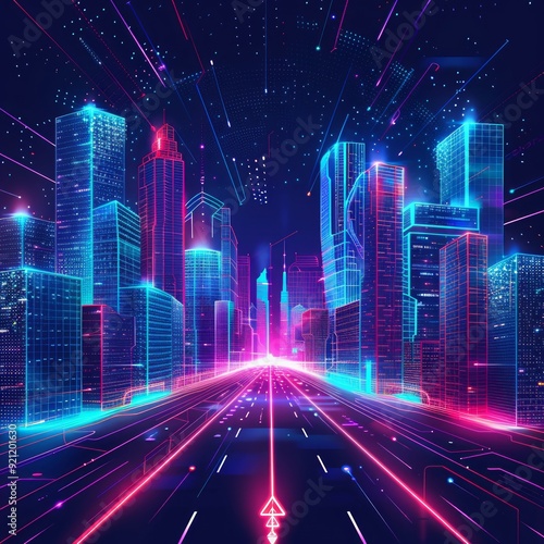 Vector illustration urban architecture, cityscape with space and neon light effect. Modern hi-tech, science, futuristic technology concept. Abstract digital high tech city design for banner background