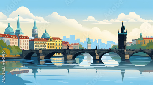 vector illustration, vector illustration of Prague, world famous Charles bridge in the capital city of the Czech republic. Typical view with the Charles bridge over the river characteristic buildings