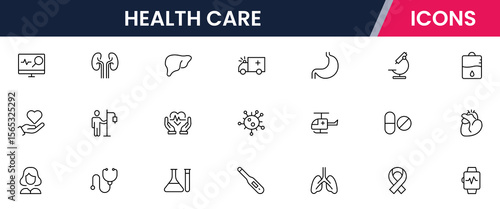Vector line icons of medical tools, hospitals, doctors, health records, wellness, diagnosis, treatment, and care perfect for apps and websites.
