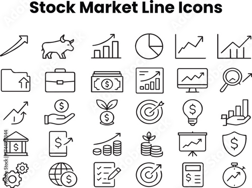 Vector line icons representing market trends, bullish and bearish symbols, charts, analytics, and financial indicators for fintech and investment platforms
