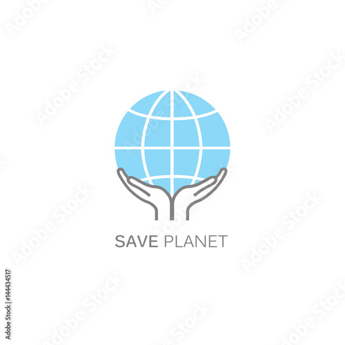 Vector logo design template in linear style - hands holding a globe.