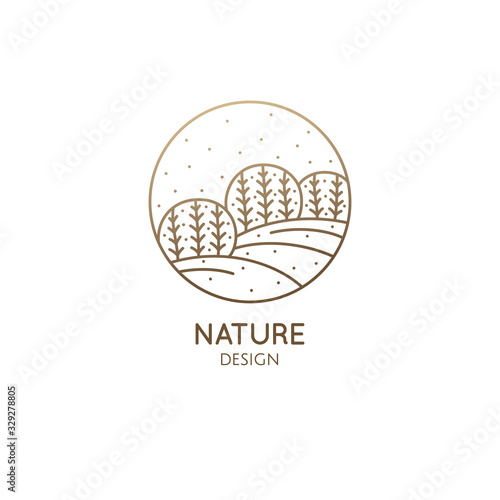Vector logo of nature in linear style. Outline icon of winter landscape with trees,sun,fields,snow - business emblems, badge for a travel, farming and ecology concepts, health, spa and yoga Center.