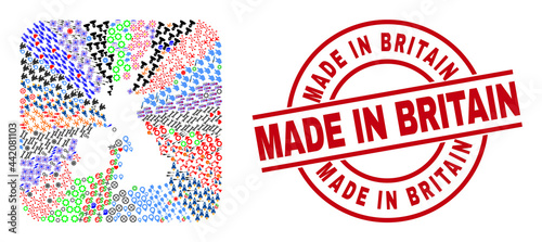 Vector mosaic Great Britain and Ireland map of different pictograms and Made in Britain seal. Mosaic Great Britain and Ireland map created as carved shape from rounded square.