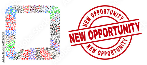 Vector mosaic New Mexico State map of different symbols and New Opportunity badge. Mosaic New Mexico State map constructed as hole from rounded square. Red round stamp with New Opportunity text.