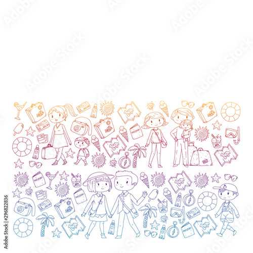 Vector pattern with travel and beach icons. Parents with little kids. Children summer vacation.