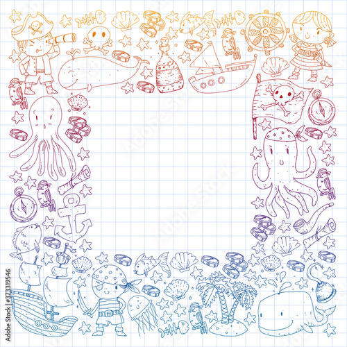 Vector pirate set in cartoon style. Sweet card with pirates, ship, whale, crab, octopus, mermaid, rum, anchor, treasure, fish, island and parrot.
