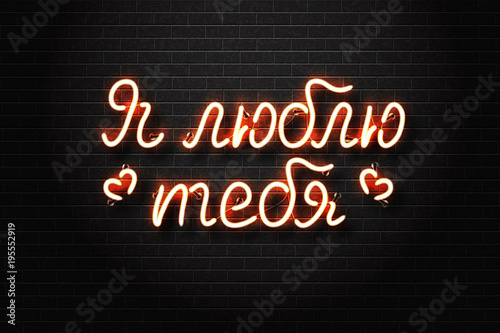Vector realistic isolated neon sign I Love You lettering with hearts for decoration and covering on the wall background. Translation from Russian language: I love you.