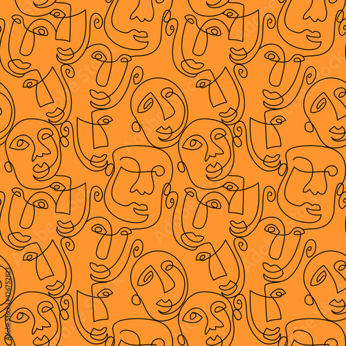 Vector seamless pattern with abstract faces. A line drawing, a black line on a bright orange background. Hand-drawn illustration.