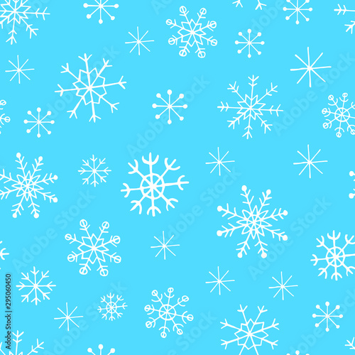 Vector seamless pattern with simple white linear snowflakes on light blue. Winter holiday decor/