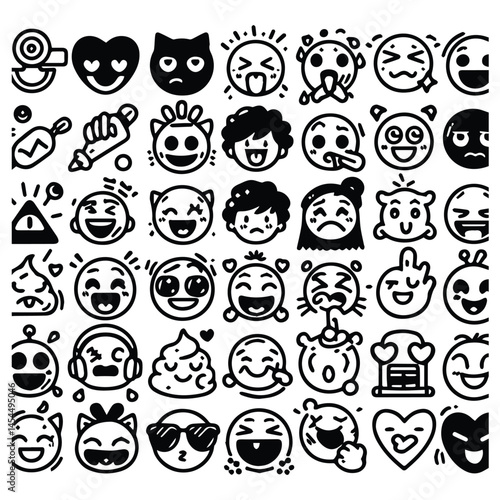vector set emoticon doodle art simple line style black white