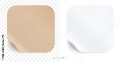 Vector set of adhesive stickers with a folded edges. Tan cardboard and white paper rounded squares. Blank templates of a price tags. Empty mockup for any memos. Realistic textures. Transparent shadows