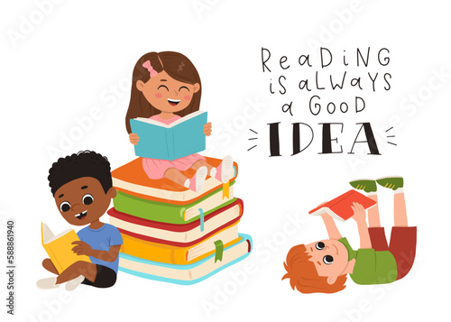 Vector set of cartoon children reading books. Multiracial kids in different poses with book and phrase Reading is always a good idea.