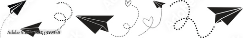 Vector set of hand drawn doodle paper airplane isolated on white background. Line icon symbol of travel and route. Vector icon.Paper plane with dotted line, Origami paper airplane, Travel symbol,