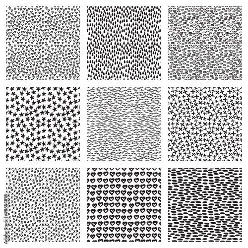 Vector set of seamless patterns. Sketch backgrounds with spirals, helix, smile face, rings, polka dots, stars, flowers, butterfly, hearts, squares and ovals. Hand drawn hipster doodles.