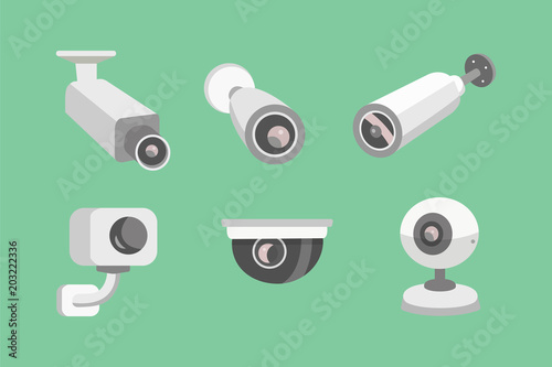 Vector set security camera. CCTV cartoon illustration. Safety and watching.