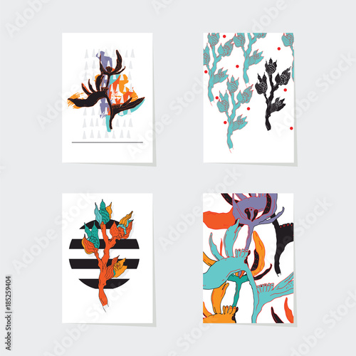 Vector set with bright vertical flower cards drawn in imperfect style, isolated. Heliconia and wild tropical branches with contrast colors design.