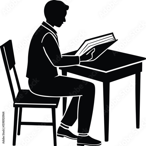Vector silhouette of a teacher sitting at a desk, reading a book or reviewing exam papers