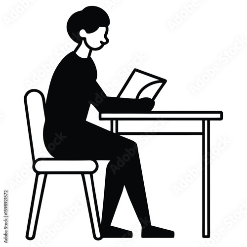 Vector silhouette of a teacher sitting at a desk, reading a book or reviewing exam papers