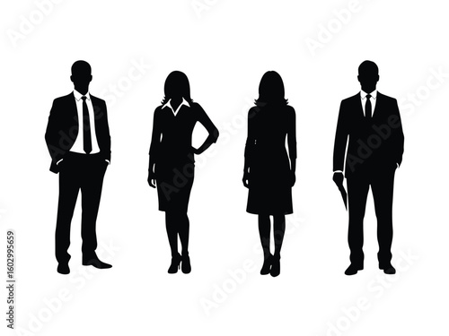 Vector silhouettes of diverse business people: men and women in professional attire, perfect for corporate, office, and teamwork-related designs