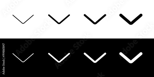 Vector single arrow chevron down icon. Black, white background. Perfect for app and web interfaces, infographics, presentations, marketing, etc.