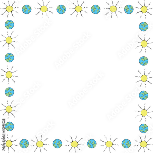 Vector square frame, border from the Earth and the Sun in doodle flat style. Bright background, decoration on theme of space, astronomy, kids design