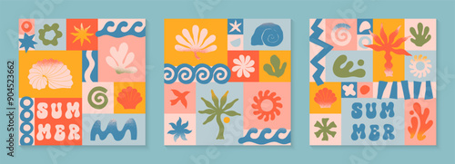 Vector summer illustrations with nature organic shapes,doodles.Groovy boho palm,beach,surf,waves,sun,seashells graphic symbols and elements.Summer vacation backgrounds in simple funny style.