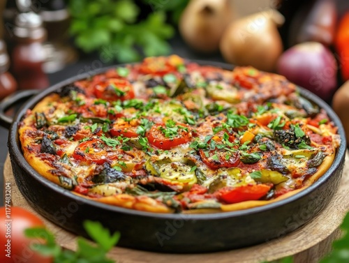 Vegetarian pizza with colorful toppings in a rustic setting, surrounded by fresh vegetables and herbs, ideal for home dining concepts.