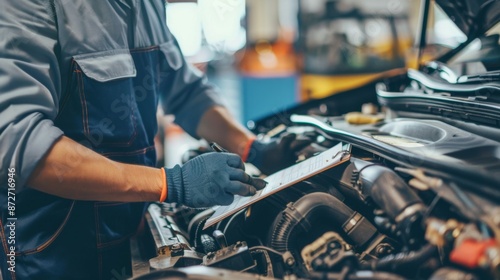 Vehicle repairman examining the engine and making notes on a checklist