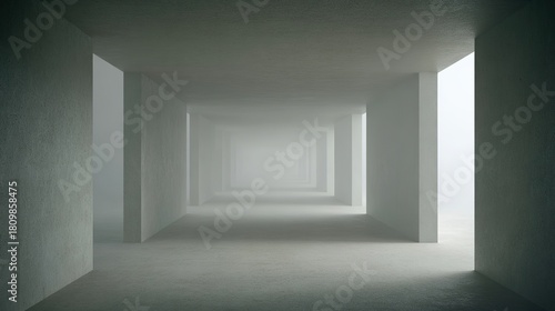 veil. A foggy grey corridor with distant doorways and soft, diffused lighting. real-estate listings, architecture portfolios, designed for real-estate listing and luxury residence showcases.