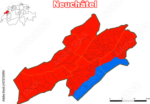 Vektor Karte Schweiz Administrative Gliederung Kanton Neuchâtel mit name der Kommune