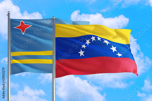 Venezuela and Aruba national flag waving in the windy deep blue sky. Diplomacy and international relations concept.