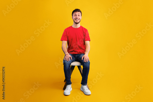 Verical full length portrait of young smiling bearded man sitting on the chair and looking at camera, isolated over blue background wall, studio shot. Seated guy resting and relaxing
