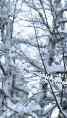 Vertical Macro Detail Hoar Frost Crystals On Branch Against Bokeh Texture