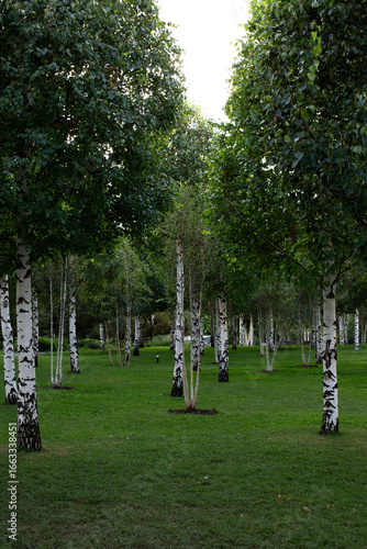 Vertical photo of birch grove with neatly trimmed grass, ideal for use as natural background on mobile devices. Image upright orientation emphasizes growth of birch trees and peaceful surroundings